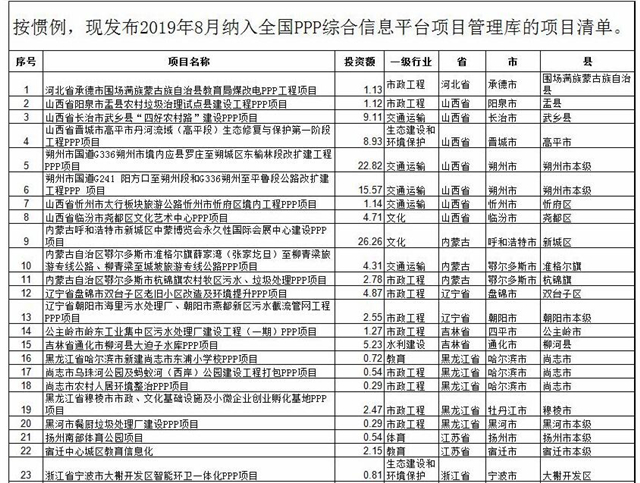 按惯例,现发布2019年8月纳入全国PPP信息平台项目管理库的项目清单。